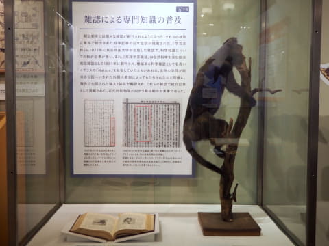 ディスプレイには、一匹のサルの標本と「動物学雑誌」が展示されている。標本は、1898年に台湾で採集されたもの。サルの隣に置かれた同誌の1ページを見ると、全く同じ個体のサルの標本が載っていることが分かる。