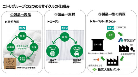 ニトリではカーテンのほか、羽毛布団、カーペット、敷布団の回収、リサイクルに取り組んでいる。