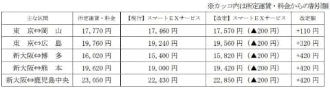 例えば、東京⇔広島の現行のスマートEXサービスでの料金は19,240円だが、改定後は320円値上げとなる19,560円で、通常運賃から200円の割引となる。