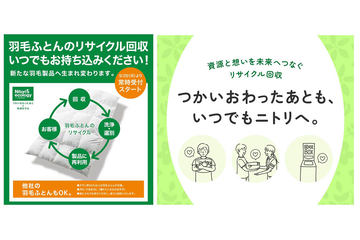 ニトリは、全国のニトリ・ニトリEXPRESS・島忠・島忠ホームズ・ニトリホームズの全店舗にて、不要な羽毛布団のリサイクル回収を実施する。期間は10月2日~12月31日。