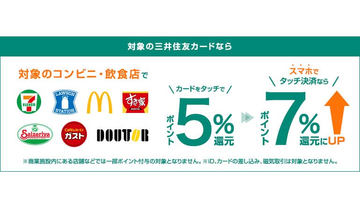 三井住友カードは、スタンダードカードのサービス向上策として、Vポイントで最大7%還元となる対象店舗を10月1日に追加した。また対象サービスも追加する。