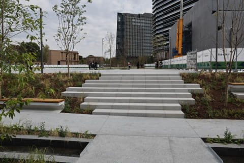 「希望の広場」は、国立競技場と同じ天然芝(約1,000m2)を敷き詰め、イベント会場としての利用も想定しており、広場を囲うようにベンチデッキを配置している。