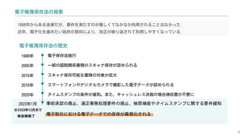 '22年1月には、ハードルの1つとなっていた、保存開始3カ月前までに税務署長の事前承認が必要という要件が廃止され、電子取引における電子データでの保存が義務化された。それまで電子データを紙に印刷して保存することが許容されていたが、これが不可となった。