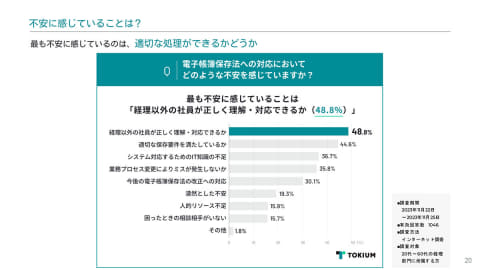 上記のような対応が迫られる中、TOKIUMの調査では電帳法への対応に不安を感じている経理は約60%(とても感じている20.6%、やや感じている42.7%)にのぼる。営業など各担当部署で取り扱う見積書や契約書なども対象となることから、特に「経理以外の社員が正しく理解・対応できるか」に不安を感じているという。
