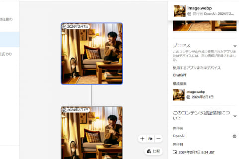 C2PAは、コンテンツの来歴情報の標準化を行なう団体。ChatGPTやOpenAIサービスによるDALL-E3(画像生成AI)で作成した画像に、メタデータを付与することで、「AIで作成した画像」であることを示す。メタデータは削除できてしまうが、OpenAIでは、「出所を確立する手段を採用することは、デジタル情報の信頼性を高めるための一歩となる」としている。