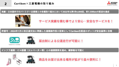 Cartkenと三菱電機の取り組みについては、2022年以降、約4,000回、7,500kmの配送を行なっており「十分な蓄積を積み重ねている」と強調。2024年1月の改正道交法に準拠した遠隔操作型小型車としての安全基準にも合格しており、さらにエレベーターやセキュリティドアなどのビル設備との連携による縦移動も含めて屋内搬送にも既に対応しているという。今後は商品を受け取る場所を屋内外問わず広げていく。さらに関連会社のメルコモビリティソリューションと共にサービス可能エリアを広げる。一般ユースだけでなく、工場内搬送へのロボット適用も進めていきたいと述べた。