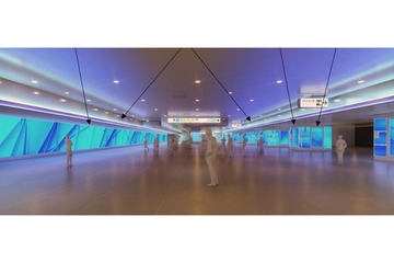 大型サイネージはBOX・BLOCK・BELTの3つを用意。BOXは約3.2×5.7m(縦×横)の3面で構成された、音声出力が可能な立体的映像メディア。BLOCKは約133m2で、コンコース内の12本の柱4面にフレームレスに設置された合計48面のサイネージ。BELTは約64m2で、壁面上部に設置された横長のサイネージ。サイズは約1×59.5m(縦×全長)。