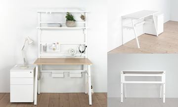 厚み約45mmまでの天板に取り付け可能で、ワークデスクのほかダイニングテーブルにも使用できる。また、60cm幅モデルはクランプの位置を変えてL型にすることもできる。