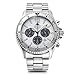 クロノグラフ(ストップウォッチ)機能は1/5秒の計測が可能で、サブダイヤルは3時位置が24時間表示、6時位置がストップウォッチの60分積算計、9時位置がスモールセコンド(時刻の秒針)。インデックスの5時付近にデイト表示窓を備える。