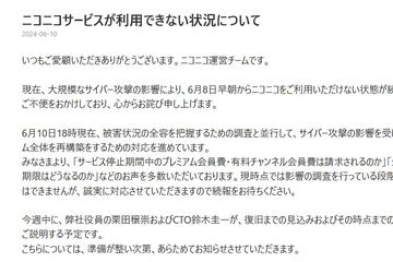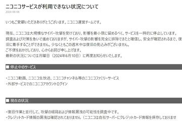 この問題は、6月8日発生したニコニコに対するサイバー攻撃が起因。攻撃を確認後、直ちに関連するサーバーをシャットダウンするなど、緊急措置を実施し、対策本部を立ち上げて対応を進めている。