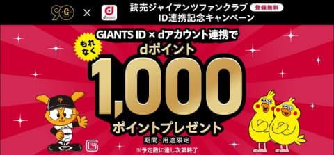 今回の連携を記念し、「ID連携記念キャンペーン」と「GIANTS ID・dアカウント連携デー試合観戦チケット・オンユアマークスプレゼントキャンペーン」などを開始。連携開始キャンペーンでは、期間中に「GIANTS ID」と「dアカウント」を連携した全員にdポイント(期間・用途限定)1,000 ポイントを進呈する。