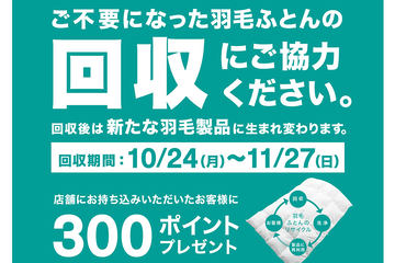 9月2日から2月2日までの期間に対象店舗もしくはニトリネットで買物をし、9月30日からの回収期間に羽毛布団を持ち込んだ人に、ニトリポイント300ポイントをプレゼントする。さらに、羽毛布団を合計9,990円(税込)以上購入で300ポイント、ニトリアプリへの新規会員登録で200ポイントをプレゼントする。