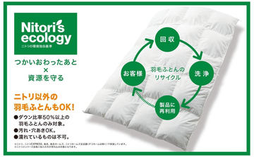 ニトリグループは、処分時の消費者の困りごとを解決すると同時に資源を守るため、商品のリサイクル回収の取り組みを推進している。羽毛布団のリサイクル回収は毎年期間限定で実施している。