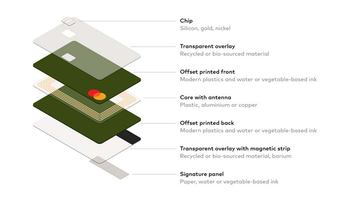 再生プラスチックを使用したカードは裏面にその旨が記載される。例えば76%利用している場合は、「MADE WITH 76% RECYCLED PLASTIC」と印字される。
