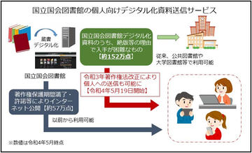 本サービスは、2021年の著作権法改正により、図書館等では利用者の調査研究のため、著作物の一部分をインターネット等で送信すること(図書館等公衆送信サービス)が可能になったことから提供が可能になったサービス。権利者、出版社、図書館等の関係者による「図書館等公衆送信サービスに関する関係者協議会」の合意を踏まえ、サービスを提供する。