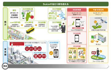 Suica Renaissanceでは、26年秋頃に「モバイルSuica」アプリによるコード決済などの新たな決済体験を、28年度には利用者に応じた割引やクーポンなどの移動体験の提供を進め、10年以内にはチケットやSF(電子マネー)などのバリューをセンターサーバーで管理するサービスを目指す。その実現のために「Suicaアプリ(仮称)」の提供も予定している。