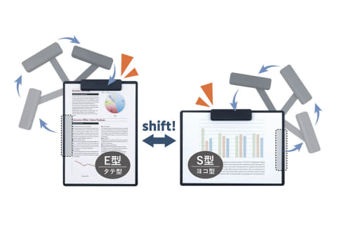 シフテは「移動式クリップ綴具」を採用した、書類に合わせてクリップを移動することでタテ向き(E型)とヨコ向き(S型)を使い分けられるクリップボード。今まで2種類のクリップボードを用意していた人や、仕方なく向きの違うクリップボードを使用していた人にとっては、シフテ1つで常に効率の良い形状で作業できるとしている。