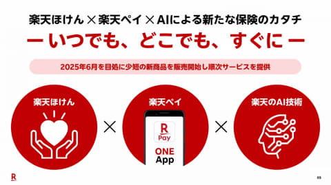 また、ここでも楽天エコシステムの基盤やAIが活用される。例えば熱中症保険の場合、気温の予想や、ユーザーの旅行先の地域といった情報に基づき、朝の段階で熱中症保険への加入をオススメするといった具合で、ユーザーの行動に紐づけカスタマイズしたレコメンドの仕組みを構築する。