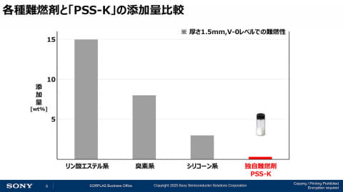 特徴は、独自難燃剤「PSS-K」を活用することで、少ない添加量で高い難燃性能を実現できること。そのため、回収ディスクやヘッドランプなどの再生材料の比率を高められる。ソニーをはじめとする製品メーカーでは、石油系資源使用量の削減とGHG(温室効果ガス)排出量低減を進めており、リサイクルプラスチックの利用拡大は急務になっており、SORPLASには高いニーズがあるという。