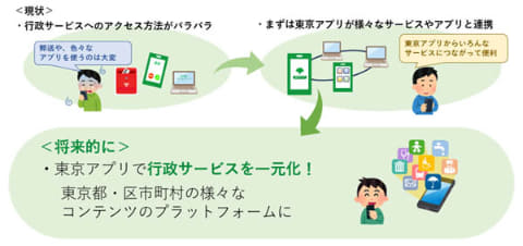 現状は、行政サービスへのアクセス方法がバラバラで、いろいろなアプリを使う手間が発生するほか、郵送での手続きもある。こういった課題に対し、東京アプリが様々なサービスやアプリと連携。将来的には東京都や区市町村の様々なコンテンツのプラットフォームとなり、行政サービスの一元化を図る。
