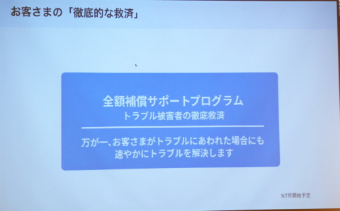 トラブル発生時の対応としては、7月に「全額補償サポートプログラム」を開始する。補償対象は別途ガイドラインを公開予定で、ガイドラインに準じた形で補償を行なう。利用者が詐欺などの被害、そのほかのトラブルに遭った際、購入代金や販売利益を上限なくメルカリが全額補償する。記者会見では補償対象となるユーザーに「本人確認済み」であることが挙げられた。