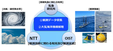 今回の研究では、NTT、OIST、気象研究所の3者がそれぞれの知見を活かし、共同で線状降水帯・台風等の観測データを直接収集。得られた観測データにより大気海洋機構の解明に貢献する。