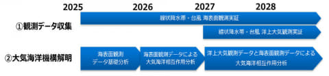 2025~2026年度は、「線状降水帯・台風 海表面観測実証」とし、自律航行が可能な無人海上観測器や観測ブイを駆使し、観測データを収集。2027年度以降は、観測対象を海表面から洋上大気(海面~対流圏下層)にまで拡張し、「線状降水帯・台風 洋上大気観測実証」とし、大気観測センサなどを併用し、観測データを収集する。大気海洋機構の解明に関しても、段階的に分析を進め、予測技術向上のための研究を促進する。