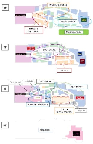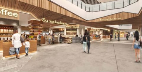 グルメに関しては、1階に20店舗の食物販「SUZAKA 蔵」、2階に14店舗の「レストランゾーン」、3階に約1,100席のフードコート「FOOD FOREST」を展開。SUZAKA 蔵は、須坂の蔵をイメージした空間にするとともに、地域の魅力を発信する場として須坂市のブースが出店し、市産品の販売や紹介、観光PRなどを行なう。