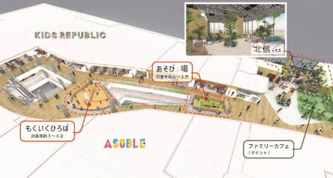 3階には長野県産材を活用した子供の遊び場「もくいくひろば」(3歳~6歳)、小さな子供も遊べる「あそびノ場」(0歳~2歳)を設置。ほかにも子供の一時預かりサービスや子育て優先エレベーター、子育て優先駐車場など、子育て世代にやさしい施設づくりに取り組む。
