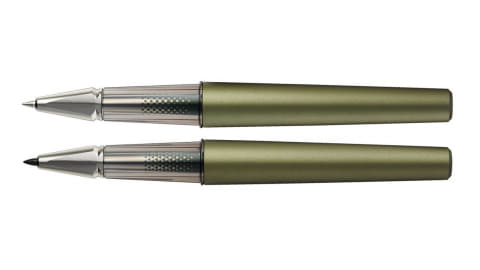 異なる書き心地を試せるよう、ファインライターとローラーボールの2種類のリフィルが付属。インク色はボディに合わせたダークグリーン。特徴は、ファインライターが樹脂製のペン先によるトメ・ハネ・はらいや線幅の表現の豊かさ、ローラーボールが粘度の低いインクによるサラサラ感。