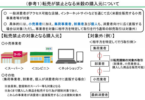 米の流通に目詰まりが生じている状況を踏まえ、価格の安定を目指す取り組み。これにあわせて、メルカリとLINEヤフーも、米穀の転売を6月23日から禁止する。政府備蓄米の転売については、5月29日から禁止されているが、この取り組みを米穀全体に広げることとなる。