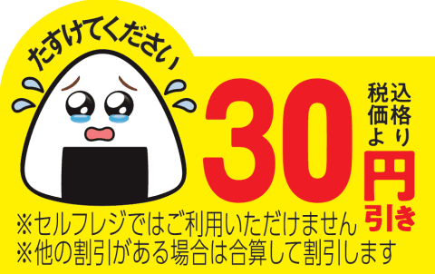 涙目おむすびからの感謝のコメントとして「ぼく、涙目おむすび。消費期限が近いぼくたちを、みんなが選んでくれたおかげで、食品ロスが減ったんだ!選んでくれてありがとう!これからお店のレジの画面に登場して感謝の気持ちを伝えるよ。」と紹介している。