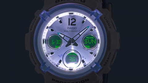 BABY-Gの「BGA-2800K」は、丸い頭と愛らしい表情のスナメリをデザインに採用。体色をイメージしたホワイトをメインカラーに、スナメリが生息する近海をバンドのライトブルーで表現した。6時位置のインダイアルリングは、スナメリがつくる天使の輪「バブルリング」がモチーフで、鮮やかなブルーを配色した。遊環にはスナメリのシルエットがプリントされる。