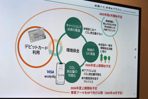 りそな銀行と埼玉りそな銀行、関西みらい銀行、みなと銀行による、デビットカードを起点としたSX(サステナビリティ・トランスフォーメーション)施策の第1弾。アプリでの機能提供に先駆け、25年10月にWeb上で簡易的にCO2排出量を算出できるツールを提供予定。
