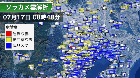 同社の予報センターでは、ゲリラ雷雨が多発する7~9月の間、ゲリラ雷雨予測の専任チームを構築。今年は全国に2,500台を展開している小型ライブカメラ「ソラカメ」の映像にAI判定を導入し、カメラに映る雲の色や明るさをAIが画像解析して「危険な雲」「要注意な雲」「低リスク」の3段階で雲の危険度を判定する。