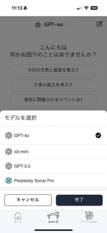 AIモデルは、OpenAIのGPT-4o、o3-mini、GPT-3.5とPerplexity Sonar Proが選択できる。