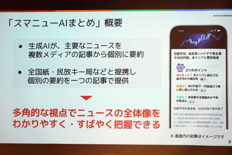 「スマニューAIまとめ」は、生成AIを活用し、主要なニュースを複数の記事から個別に要約する新機能。全国紙や民放キー局などと50以上のメディアと提携し、各記事の要約を一つの記事にまとめて提供することで、ニュースの出来事や背景を多角的な視点から伝え、ニュースの全体像を、わかりやすく伝えるニュース体験を目指す。
