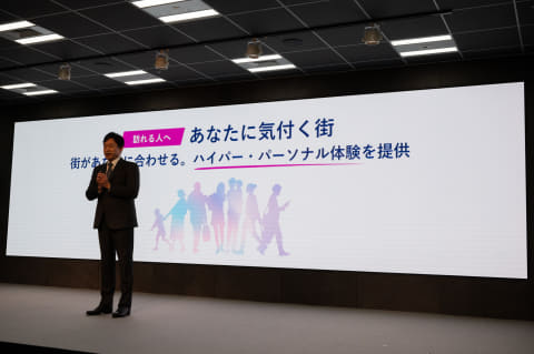KDDIの松田社長は、データの収集と分析を行なう都市OSを基盤とし、街を訪れる人と街で働く人の双方に「新しい価値を提供していく」と意気込む。「これまでは人が自ら情報を取りに行く形だった。これからは、街が能動的に情報を提供する」(松田氏)。