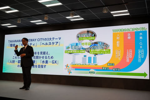 都市OSについてはJR東日本も積極的に取り組んでおり、都市OS「TAKANAWA GATEWAY URBAN OS」を中心に据えて、さまざまな連携を図っていくことが語られた。「TAKANAWA GATEWAY CITY」には環境、モビリティ、ヘルスケアという3大テーマがあり、特に通信とSuicaのかけ合わせや融合で、新たな価値を創造していく方針。モビリティについては、新規事業の「エアモビリティ」を展開する場所にもなる。