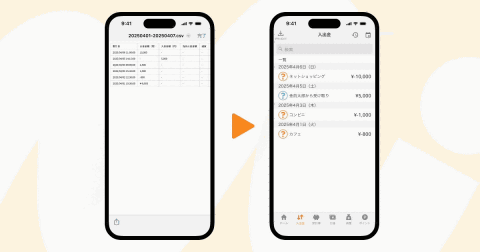 CSV取り込みは、PayPayアプリの取引履歴からダウンロードを申請し、スマートフォン上でCSVファイルをダウンロードする。その後、ダウンロードしたCSVファイルのプレビュー画面から、スマートフォンの共有アイコンをタップ、共有先として「マネーフォワード ME」を選択し、ファイルを読み込む。読み込んだ明細は、明細ごとに編集・保存できる。iOSアプリバージョン Ver.18.15.0以降で対応する。