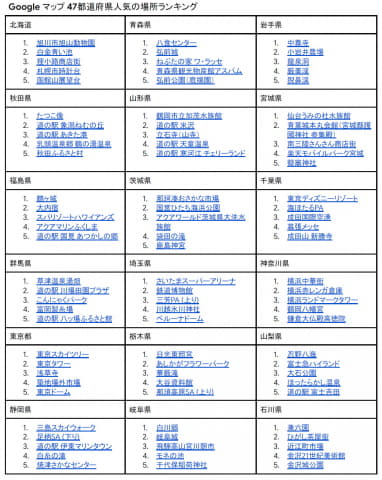 グーグルは、「Google マップ」の提供から20周年を迎えたことを記念し、Google マップで人気の場所トップ5を47都道府県ごとに発表した。