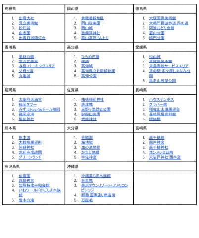 東京都は東京スカイツリーが、大阪府はユニバーサル・スタジオ・ジャパン、京都府は伏見稲荷大社がトップにラインクイン。いずれも国内外の観光客に人気のスポットになっている。ほかの県でも海外からの口コミが増えており、外国人観光客が地方にも足を伸ばし人気スポットを訪れていることが分かっている。