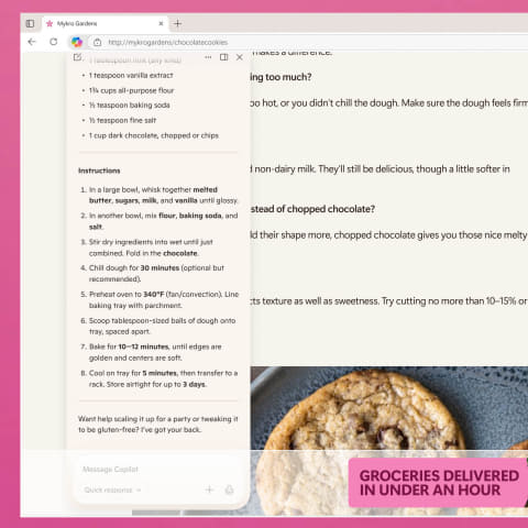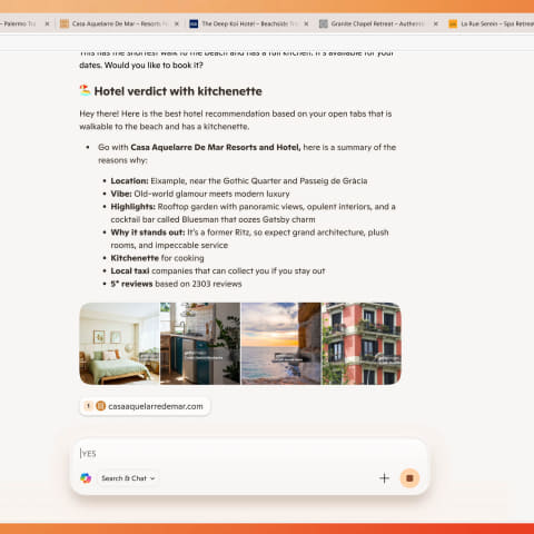 例えば複数の宿泊地に関するWebサイトを開いた状態で、「ビーチに近い」「キッチン完備」といった条件をCopilotとチャットで対話していくことで、「開いているサイトの中でどこのものが適切か」といった判断が下せるようになる。