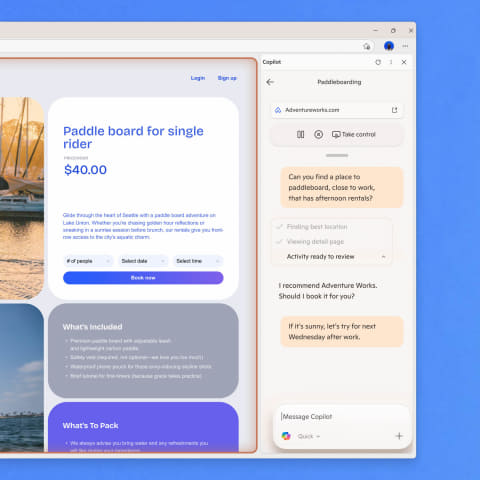 その結果として、「職場の近くでパドルボードのレンタルを探して」と尋ねるだけで、Copilotが最適なオプションを見つけるだけでなく、天気をチェックして予約を行ない、準備に役立つ日焼け止めやチュートリアルビデオまで提案してくれるようになる……とマイクロソフトは説明している。