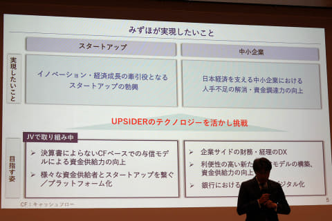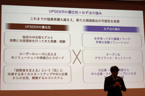 UPSIDERをみずほの顧客に展開するほか、UPSIDERのAI与信モデルをみずほ銀行でも導入。キャッシュフローを使った与信判断などで、スピード感のある融資につなげるほか、人材不足への対応も図っていく。