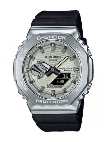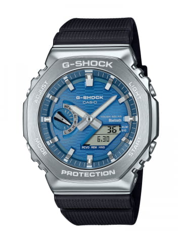 八角形のメタルベゼルが特徴のGM-2100をベースに、ソーラー発電とBluetoothによるスマートフォン連携機能を搭載するモデル。ダイヤルはそれぞれブルー、バーガンディ、ライトイエローゴールドの蒸着で、インデックスもシルバーまたはブラックの蒸着を施し、質感を高めた仕上げになっている。バンドの主な樹脂パーツにはバイオマスプラスチックが採用され、環境に配慮した仕様。