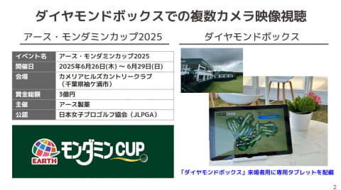 実証実験は女子プロゴルフトーナメント「アース・モンダミンカップ2025」にて、「ダイヤモンドボックス」来場者用の専用タブレットに専用アプリをインストールして実施された。専用タブレットでは従来から高画質のライブ配信の視聴や、好きなアングルを指定できるマルチアングル配信を視聴できたが、これにAIを使った選手名推定表示が加わった形。AIを用いることで、従来の人力の入力で課題だった必要人員数の多さや場所、コストの問題を解決、今回は3名体制で自動推定システムを運用した。