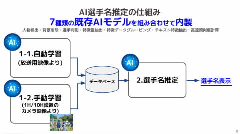 そこでソフトバンクは、当日にリアルタイム学習で判別する手法を採用。自動学習に加えて、1ホールと10ホールに用意したカメラで手動学習させる方法を組み合わせた。この内製AIは、人物検出、背景削除、選手判別、特徴量抽出、特徴データグルーピング、テキスト特徴抽出、高速類似度計算という7種類の既存AIモデルを組み合わせたもの。顔認識や事前データを用いない、当日のリアルタイム学習を用いる点が類似のサービスと異なるポイントで、ソフトバンクの優位点になるとしている。