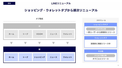 LINEヤフーは4日、2025年度第1四半期決算を発表した。その中で、LINEアプリのリニューアルも発表しており、9月からは「LINE VOOM」タブを「ショッピング」タブに刷新する。ウォレットタブも順次刷新し、PayPayとの連携を強化していく。