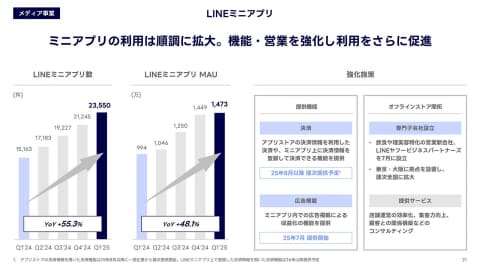 ミニアプリも順調に拡大し、機能・営業を強化している。ミニアプリ数は23,550件で前年同期比55.3%増、MAUも同48.1%増の1,473万件。8月以降に決済機能を強化予定で、ミニアプリでアプリストアの決済情報を利用するほか、ミニアプリ上に決済情報を登録して決済できる機能などを提供予定。また、ミニアプリ内での広告掲載もスタートした。